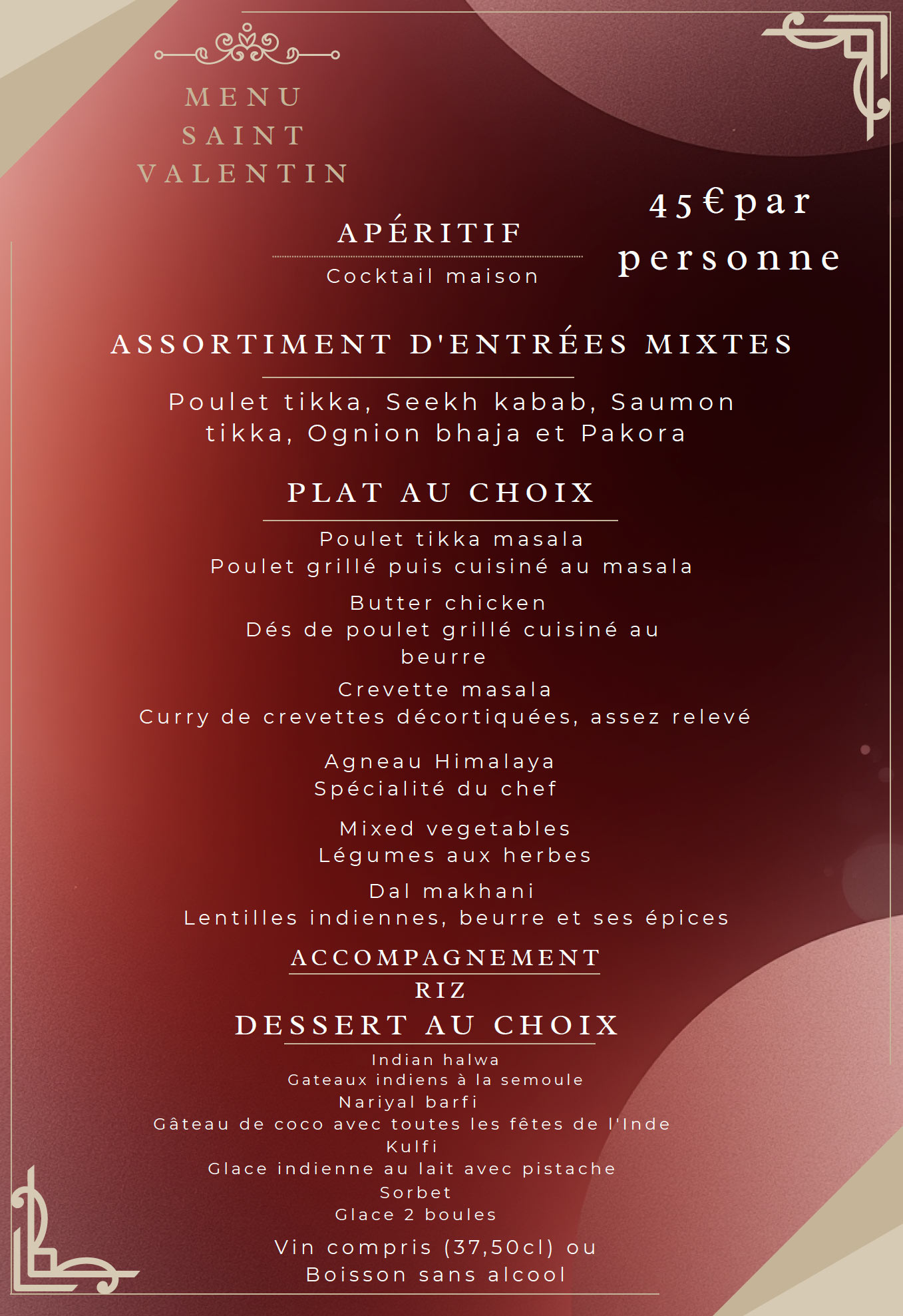Il y a possibilité de privatiser la salle pour vos événements familiaux ou professionnels, anniversaires, baptêmes, mariages, diners d'affaires, réceptions... L'Himalaya, restaurant indien de Mitry-Mory, et son équipe pétillante couvrira entièrement votre événement avec brio, et sera ravi de vous servir pour votre événement, et en faire un moment unique et mémorable. Devis et détail des prestations sur demande.